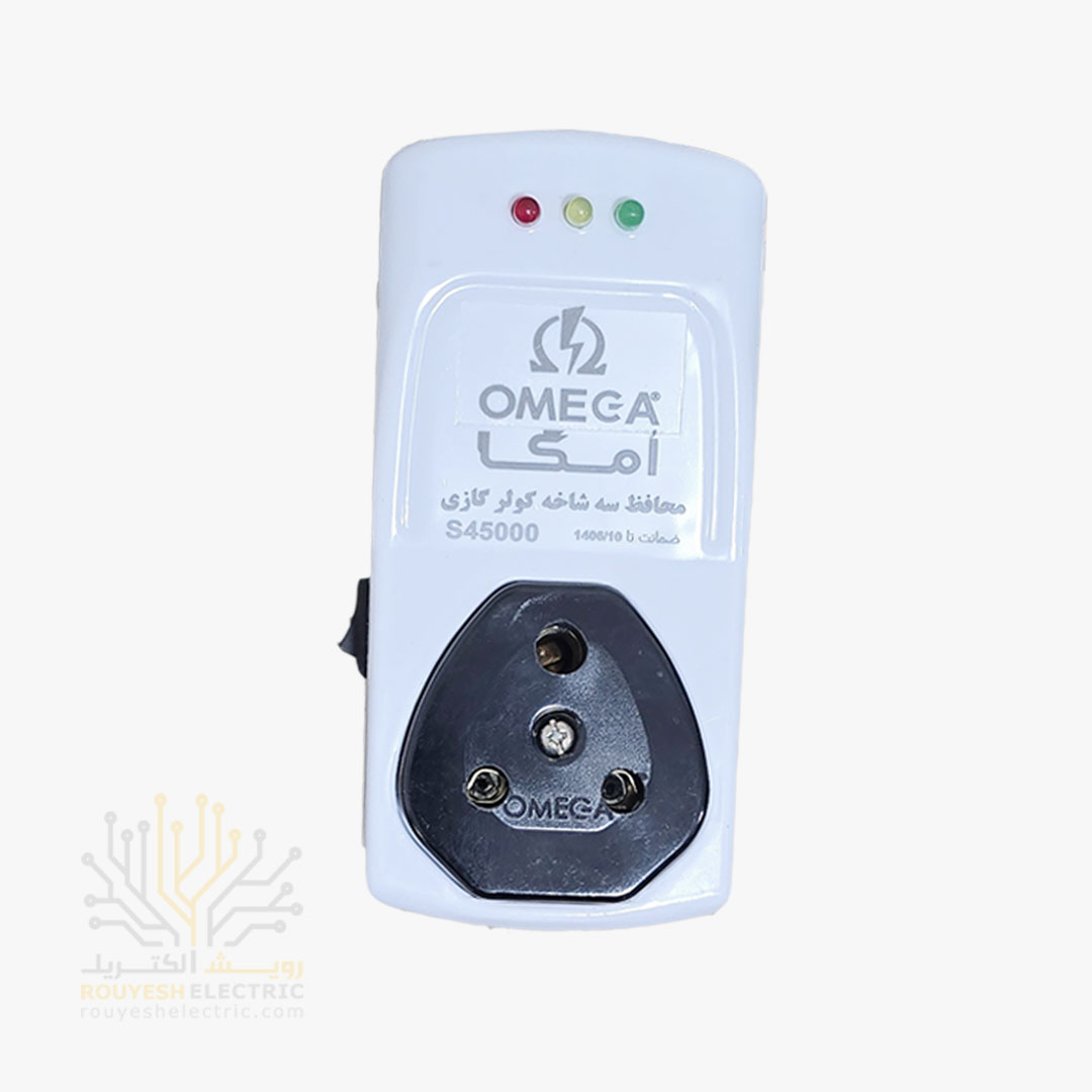 محافظ برق کولری دیواری سه شاخه برند امگا مدل S4500 استاندارد بدون ارت بدون کلید 40 آمپر رنگ سفید آنالوگ