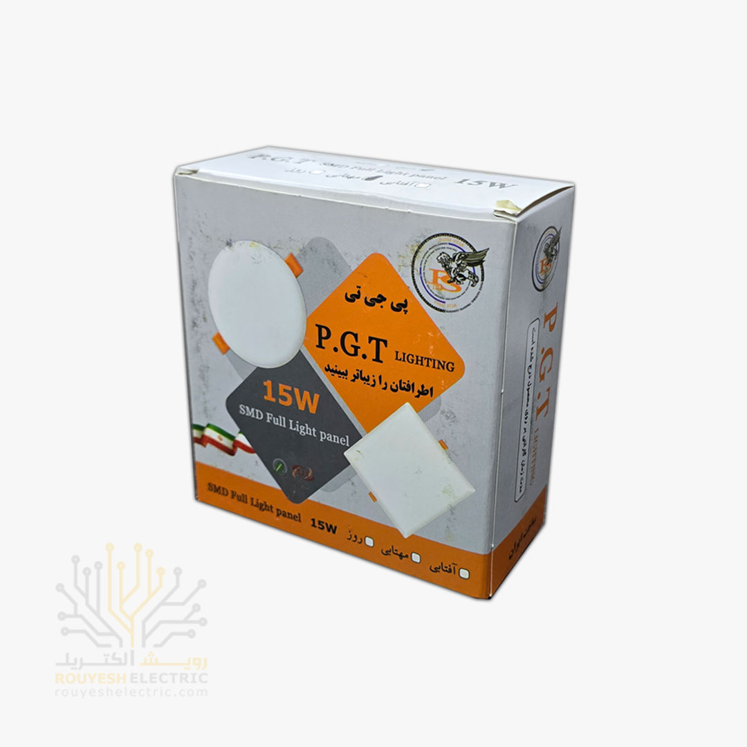 پنل سقفی توکار 15 وات برند پی جی تی PGT مدل فول لایت فنر متغیر مربع استاندارد مهتابی موجود در شرکت ما تولید کشور ایران می‌باشد. از مزایای این محصول می‌توان به قیمت مناسب نسبت به سایر محصولات مشابه ، دارا بودن نشان استاندارد ، وجود فنرهای قابل تنظیم که حفره های مختلفی را پوشش می دهند و همچنین ضمانت تعویض محصول اشاره کرد که خیال مشتریان را از بابت سلامت جنسی که تهیه می‌کنند، آسوده می‌سازد و همچنین جنس كاورپنل ازنوع PC مى باشد و به صورتى طراحى شده كه قابلیت بازتاب نور180 درجه اى (تمام نور) را دارد.