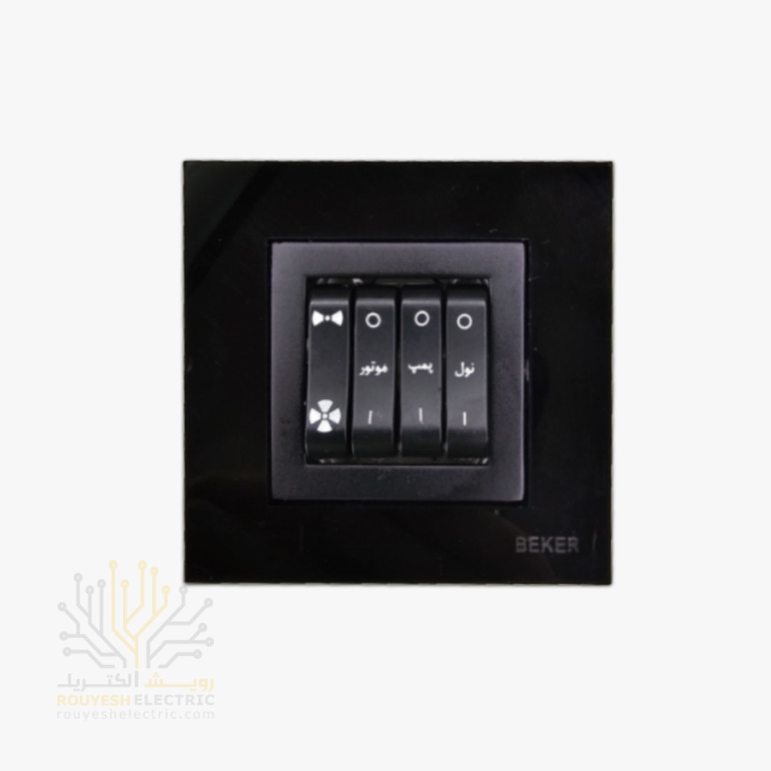 کلید کولر چهارپل توکار مدل گلس مشکی از برند ایرانی بکر، یک قطعه الکتریکی برای کنترل عملکرد کولرهای آبی است. این مدل با طراحی شیشه‌ای مشکی و نصب توکار، علاوه بر کارایی بالا، جلوه‌ای مدرن و هماهنگ با دکوراسیون داخلی فضاهای مسکونی و اداری ارائه می‌دهد. کاربرد اصلی آن روشن و خاموش کردن کولر، تنظیم پمپ آب، موتور فن و دور موتور است.