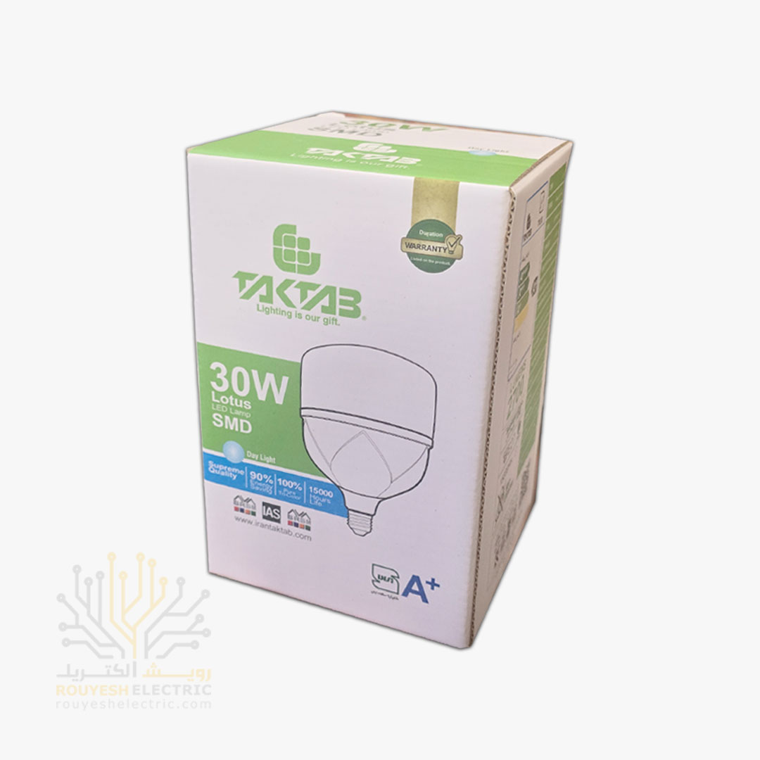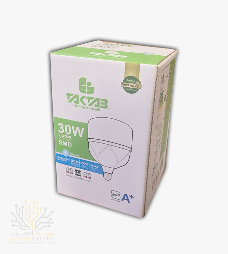 لامپ ال ای دی 30 وات استوانه برند تک تاب مهتابی موجود در شرکت ما تولید کشور ایران می‌باشد. از مزایای این محصول می‌توان به قیمت مناسب نسبت به سایر محصولات مشابه، دارا بودن نشان استاندارد و همچنین به ضمانت حداقل 15 ماه تعویض محصول اشاره کرد که خیال مشتریان را از بابت سلامت جنسی که تهیه می‌کنند، آسوده می‌سازد.