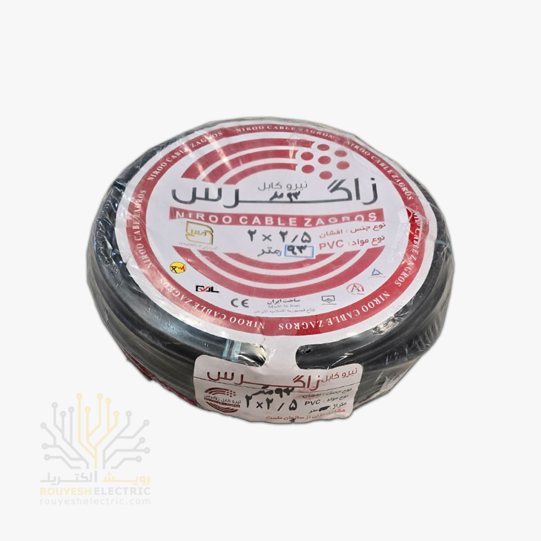 کابل برق نمره 2x2/5 برند نیرو کابل زاگرس استاندارد حلقه 93 متری موجود در شرکت ما تولید کشور ایران می‌باشد از جمله مزایای این محصول می‌توان به استاندارد بودن ، نرم و انعطاف‌پذیر بودن مغزی مسی ، روشن بودن رنگ مس و روکش پلاستیکی با کیفیت اشاره کرد. این محصول دارای ضمانت سلامت محصول است که اطمینان خاطر مشتریان را نسبت به کیفیت جنس خریداری شده فراهم می‌سازد.