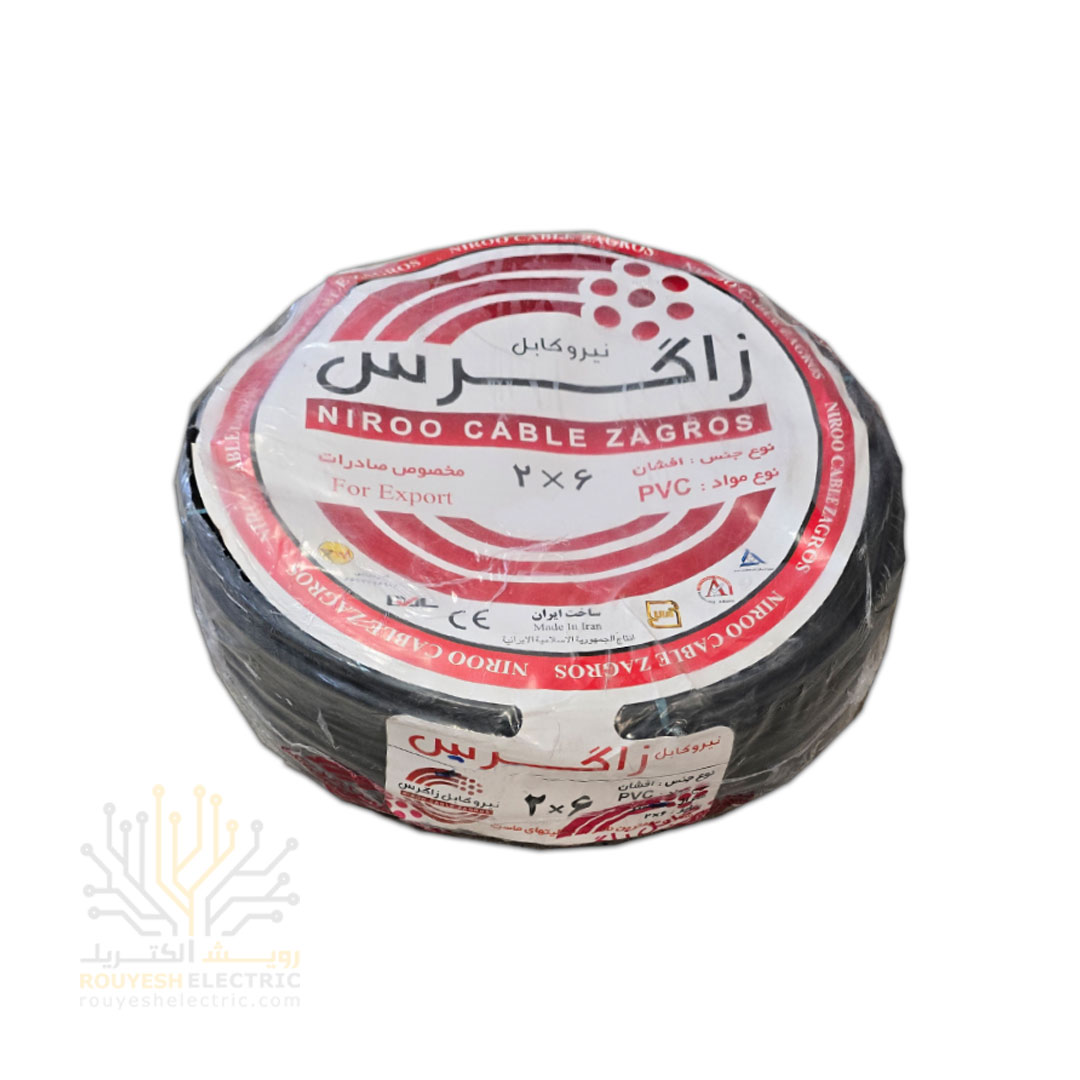 کابل برق نمره 2x6 برند نیرو کابل زاگرس استاندارد حلقه 100 متری