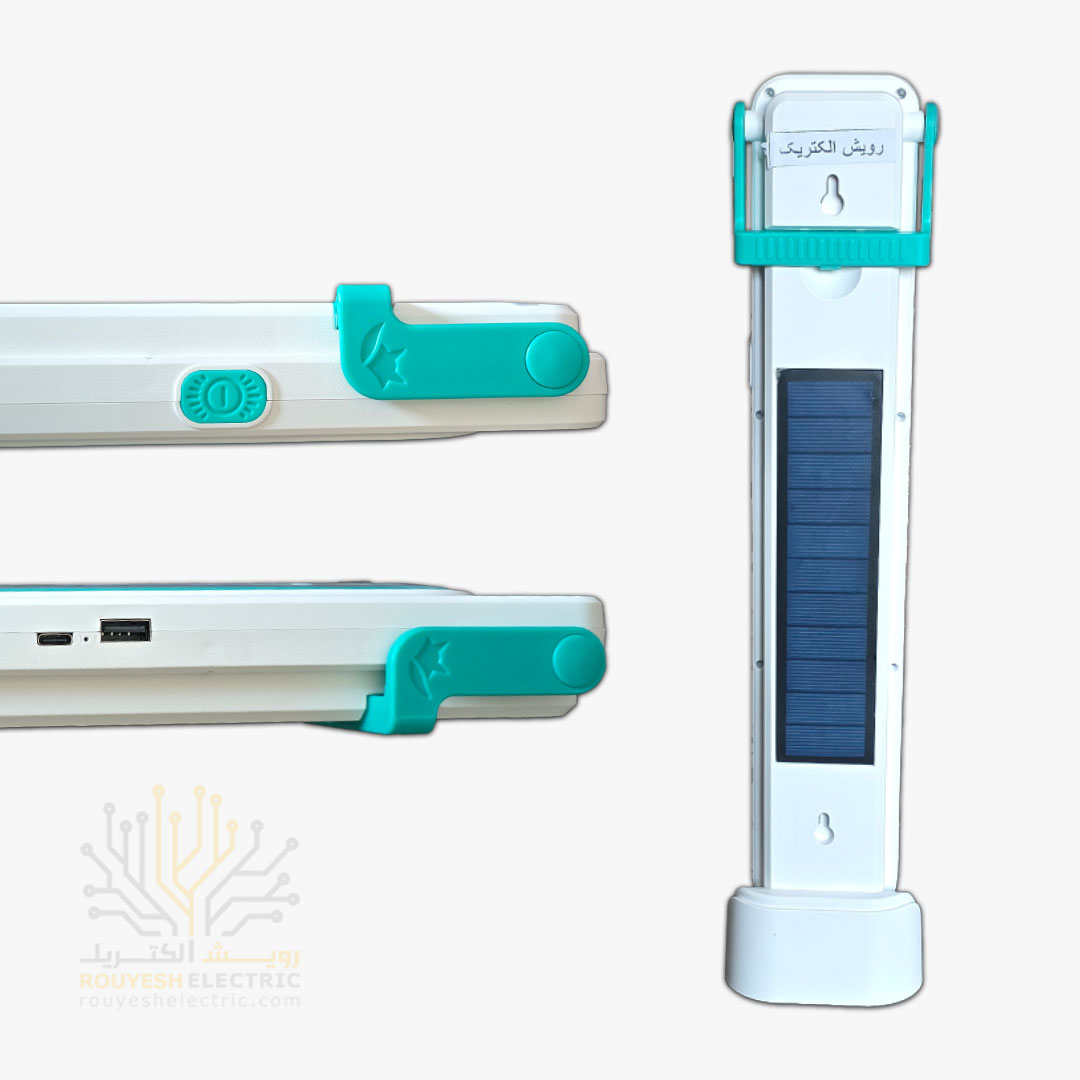 این چراغ مجهز به باتری داخلی لیتیومی است که از طریق دو روش شارژ می‌شود: پنل خورشیدی و پورت Type-C. پس از شارژ کامل (حدود ۶ ساعت)، می‌تواند تا ۴ ساعت نوردهی مداوم داشته باشد. با استفاده از ۱۷۵ عدد لامپ SMD و سیستم نوردهی ۶ حالته، کاربر می‌تواند بین حالت‌های مختلف نور سفید، زرد، ترکیبی، COB پرنور، COB ملایم  انتخاب کند. همچنین در صورت قطع برق، چراغ به‌صورت خودکار روشن می‌شود.
