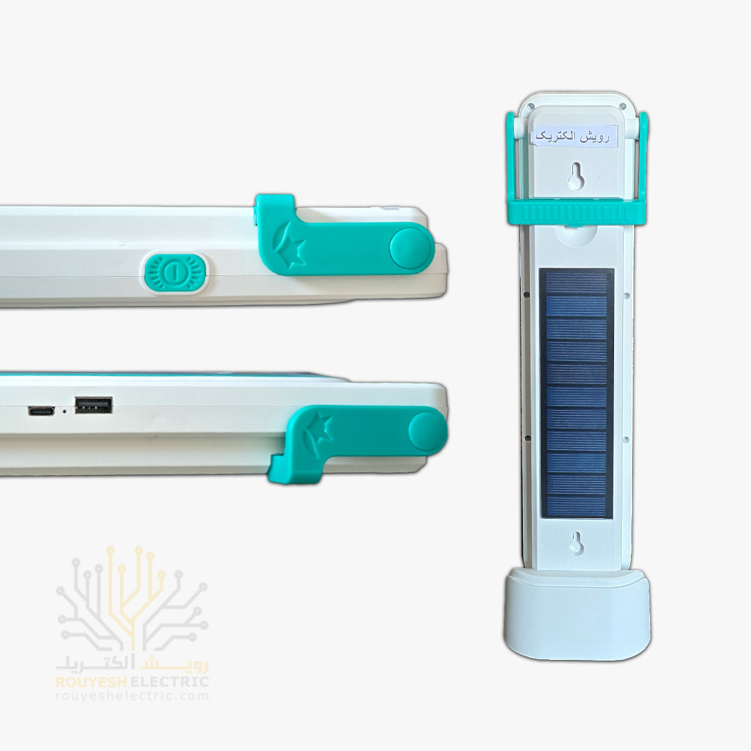 این چراغ مجهز به باتری داخلی با ظرفیت بالا است که از طریق دو روش شارژ میشود: پنل خورشیدی و پورت Type-C. پس از شارژ کامل، میتواند تا چند ساعت نوردهی مداوم داشته باشد. با بهرهگیری از ۵۰ عدد لامپ SMD LED، نور یکنواخت و قدرتمندی تولید میکند. سیستم نوردهی ۷ حالته شامل حالتهای مختلف نور سفید، زرد، ترکیبی، COB پرنور، COB ملایم است.