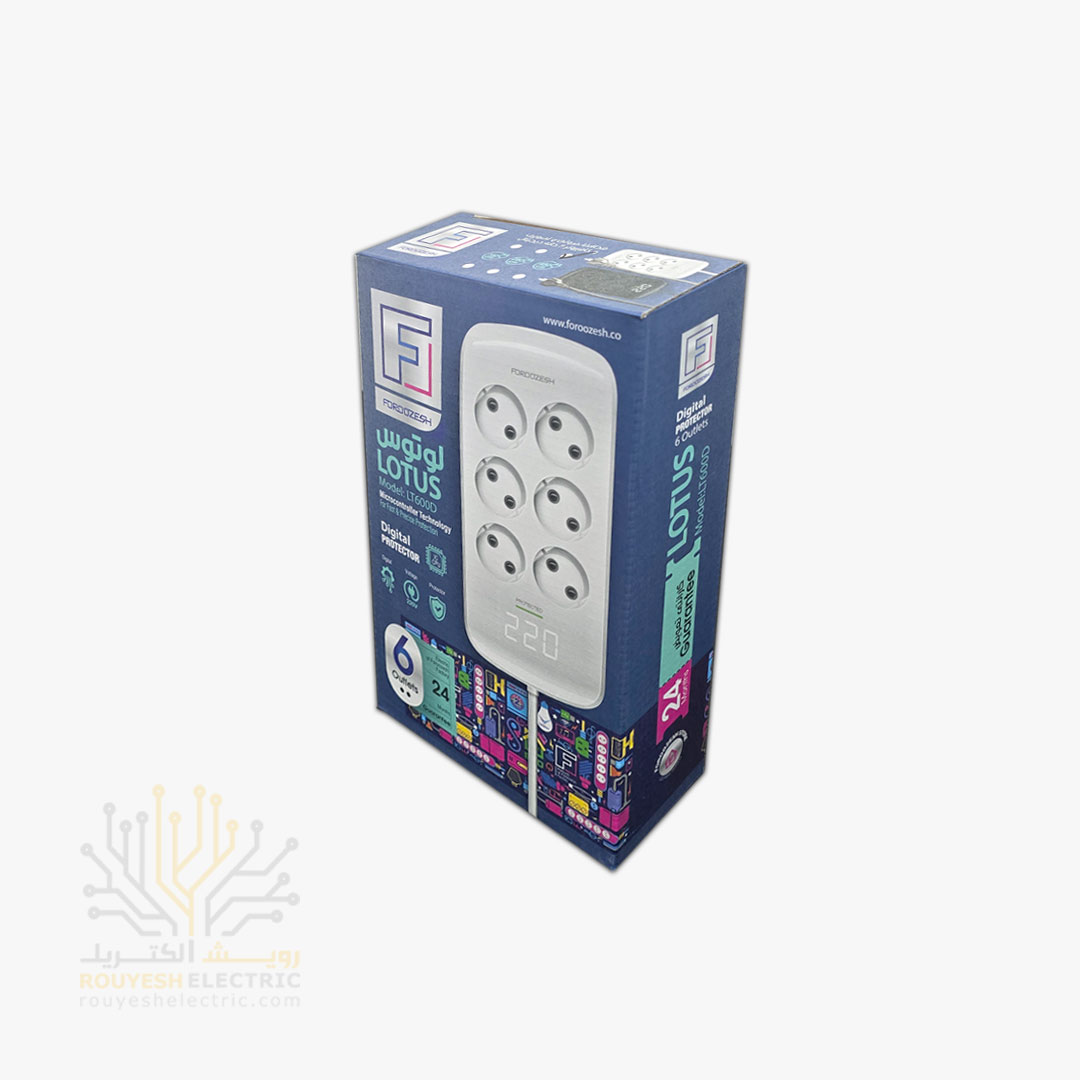 محافظ برق کامپیوتر سیار شش خانه برند فروزش مدل LT600D لوتوس بدون ارت بدون کلید بدنه سفید دیجیتال 4/8 متری
