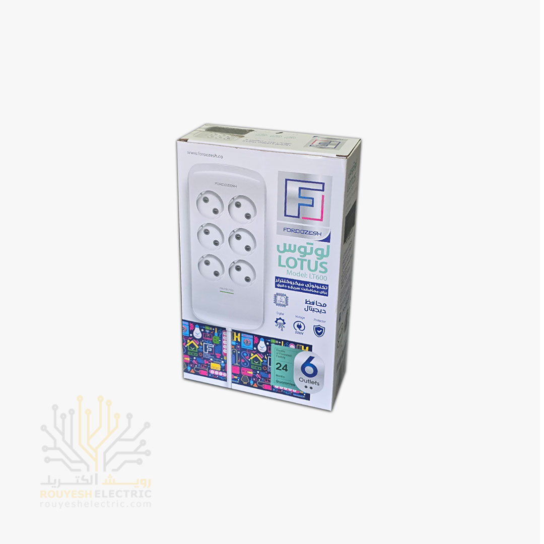 محافظ برق کامپیوتر سیار شش خانه برند فروزش مدل LT600D لوتوس بدون ارت بدون کلید بدنه مشکی دیجیتال 1/8 متری