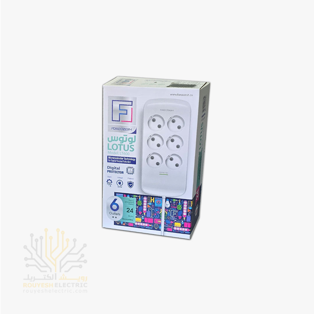 محافظ برق کامپیوتر سیار شش خانه برند فروزش مدل LT600D لوتوس بدون ارت بدون کلید بدنه سفید دیجیتال 1/8 متری
