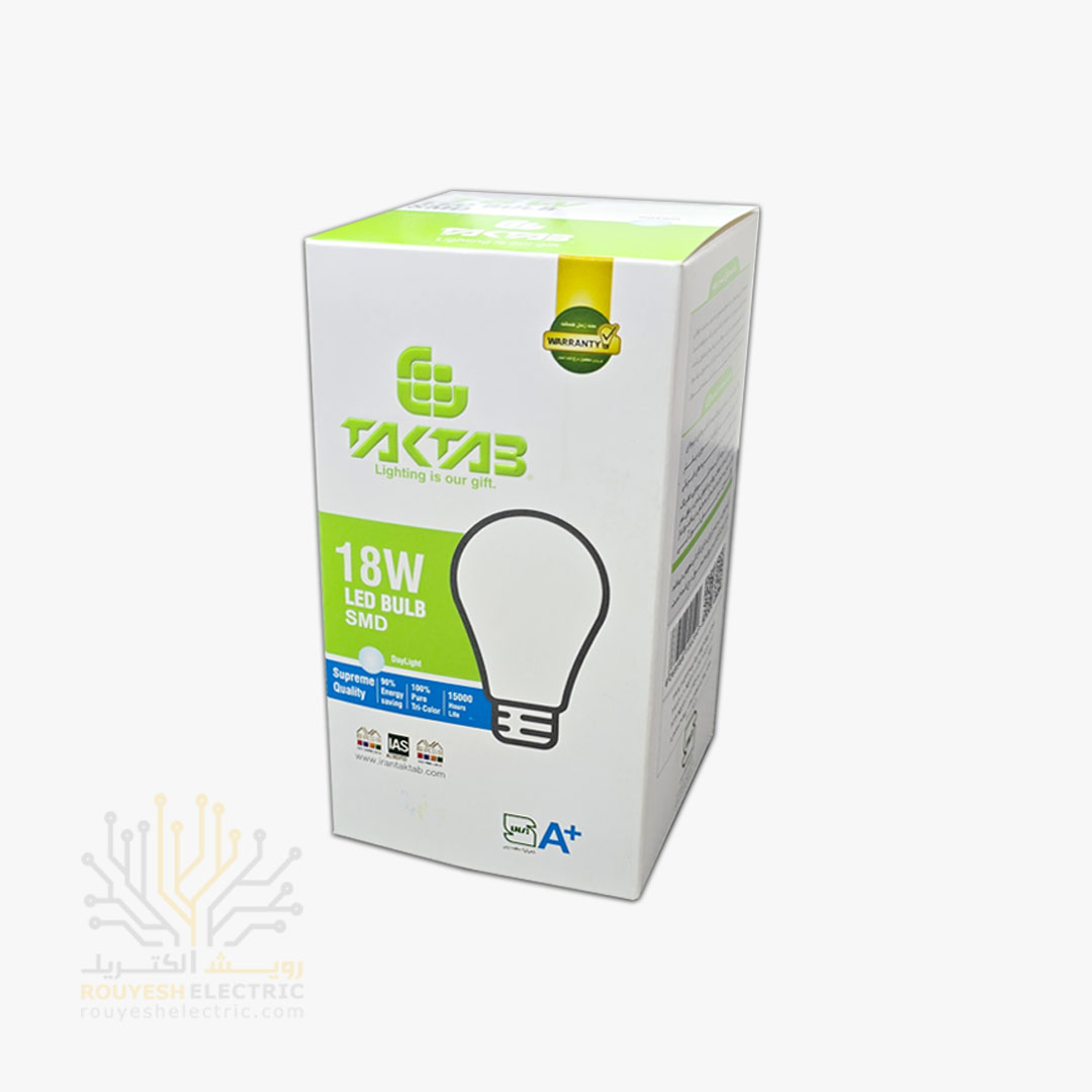 لامپ ال ای دی 18 وات حبابی برند تک تاب مهتابی موجود در شرکت ما تولید کشور ایران می‌باشد. از مزایای این محصول می‌توان به قیمت مناسب نسبت به سایر محصولات مشابه، دارا بودن نشان استاندارد و همچنین به ضمانت حداقل 15 ماه تعویض محصول اشاره کرد که خیال مشتریان را از بابت سلامت جنسی که تهیه می‌کنند، آسوده می‌سازد.