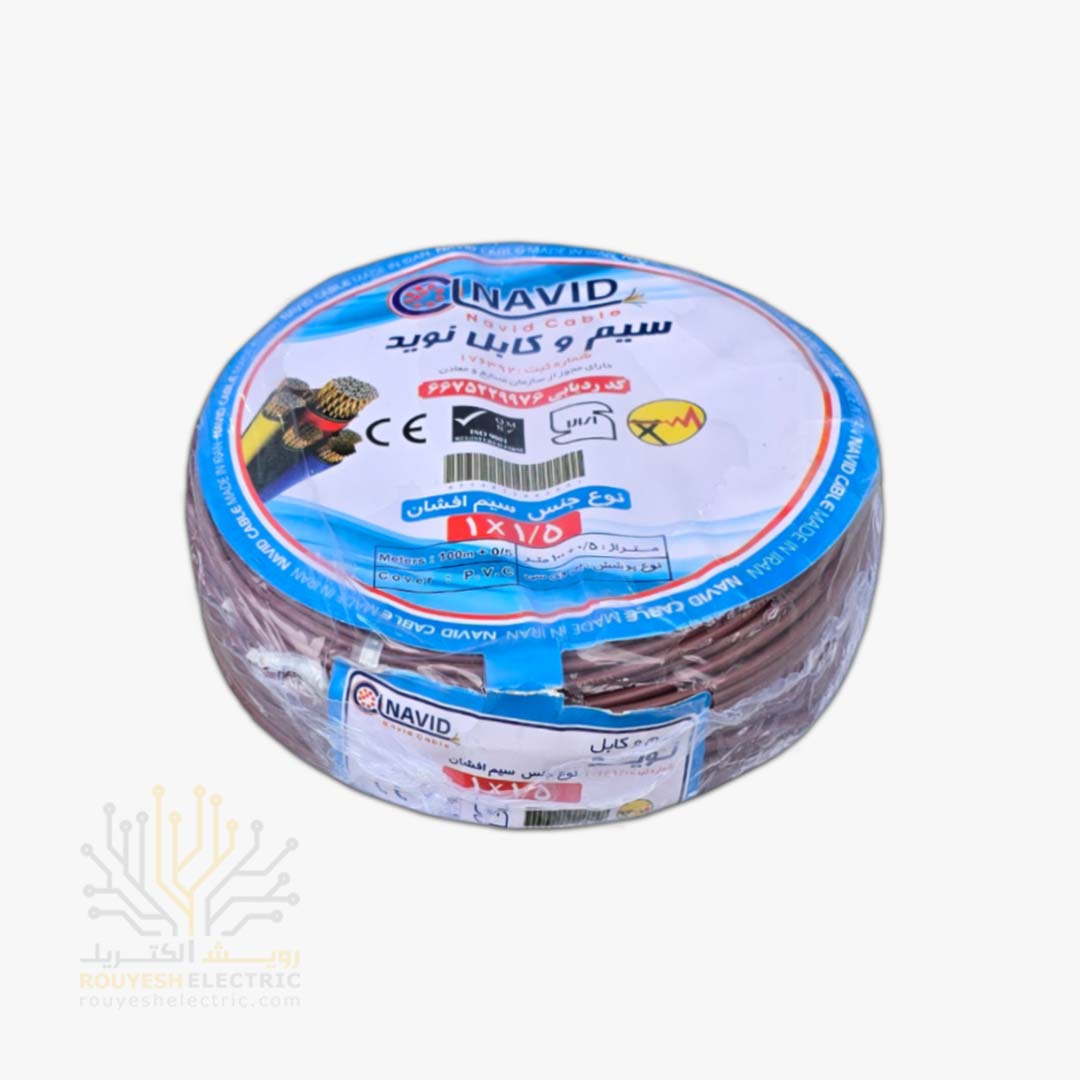 سیم برق نمره 1x1/5 برند نوید استاندارد رنگ قهوه ای حلقه 100 متری