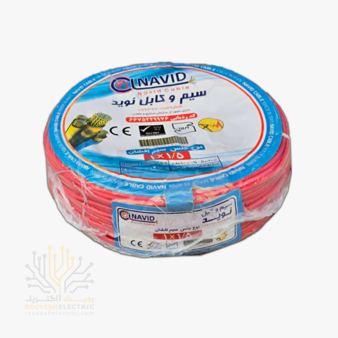 سیم برق نمره 1x1/5 برند نوید استاندارد رنگ قرمز حلقه 100 متری