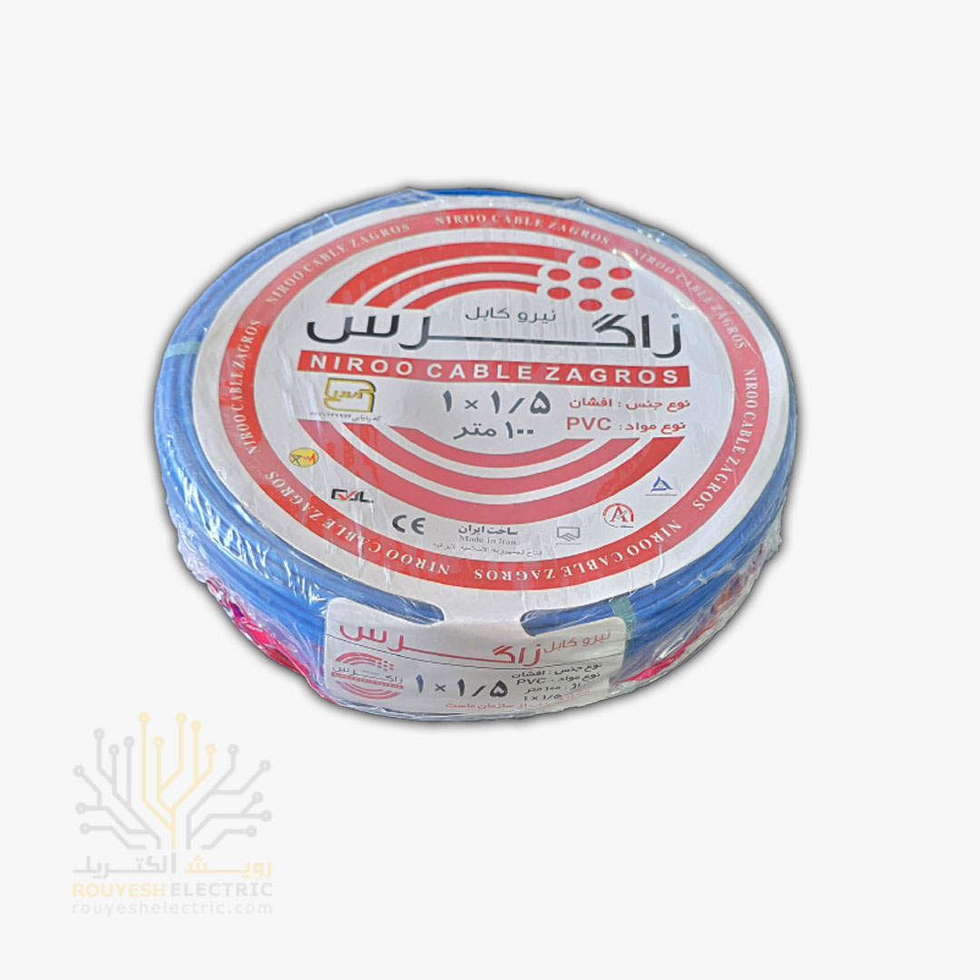 سیم برق نمره 1x1/5 برند نیرو کابل زاگرس استاندارد حلقه 100 متری آبی موجود در شرکت ما تولید کشور ایران می‌باشد از جمله مزایای این محصول می‌توان به استاندارد بودن ، تنوع در رنگ ، نرم و انعطاف‌پذیر بودن مغزی مسی ، روشن بودن رنگ مس و روکش پلاستیکی با کیفیت اشاره کرد. این محصول دارای ضمانت سلامت محصول است که اطمینان خاطر مشتریان را نسبت به کیفیت جنس خریداری شده فراهم می‌سازد.