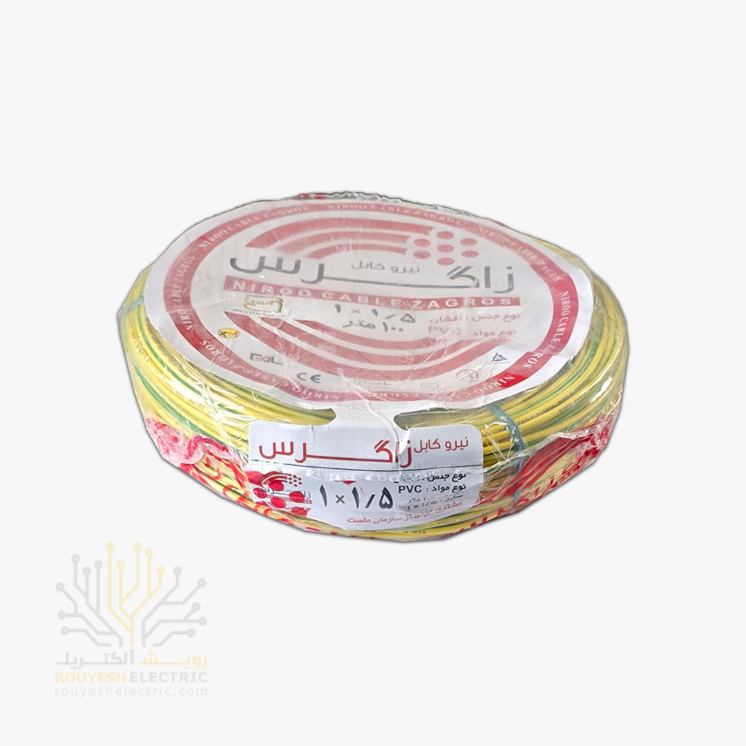 سیم برق نمره 1x1/5 برند نیرو کابل زاگرس استاندارد حلقه 100 متری رنگ ارت