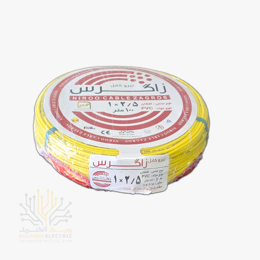 سیم برق نمره 1x2/5 برند نیرو کابل زاگرس استاندارد حلقه 100 متری رنگ زرد