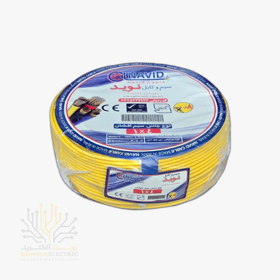 سیم برق نمره 1x4 برند نوید استاندارد حلقه 100 متری رنگ زرد