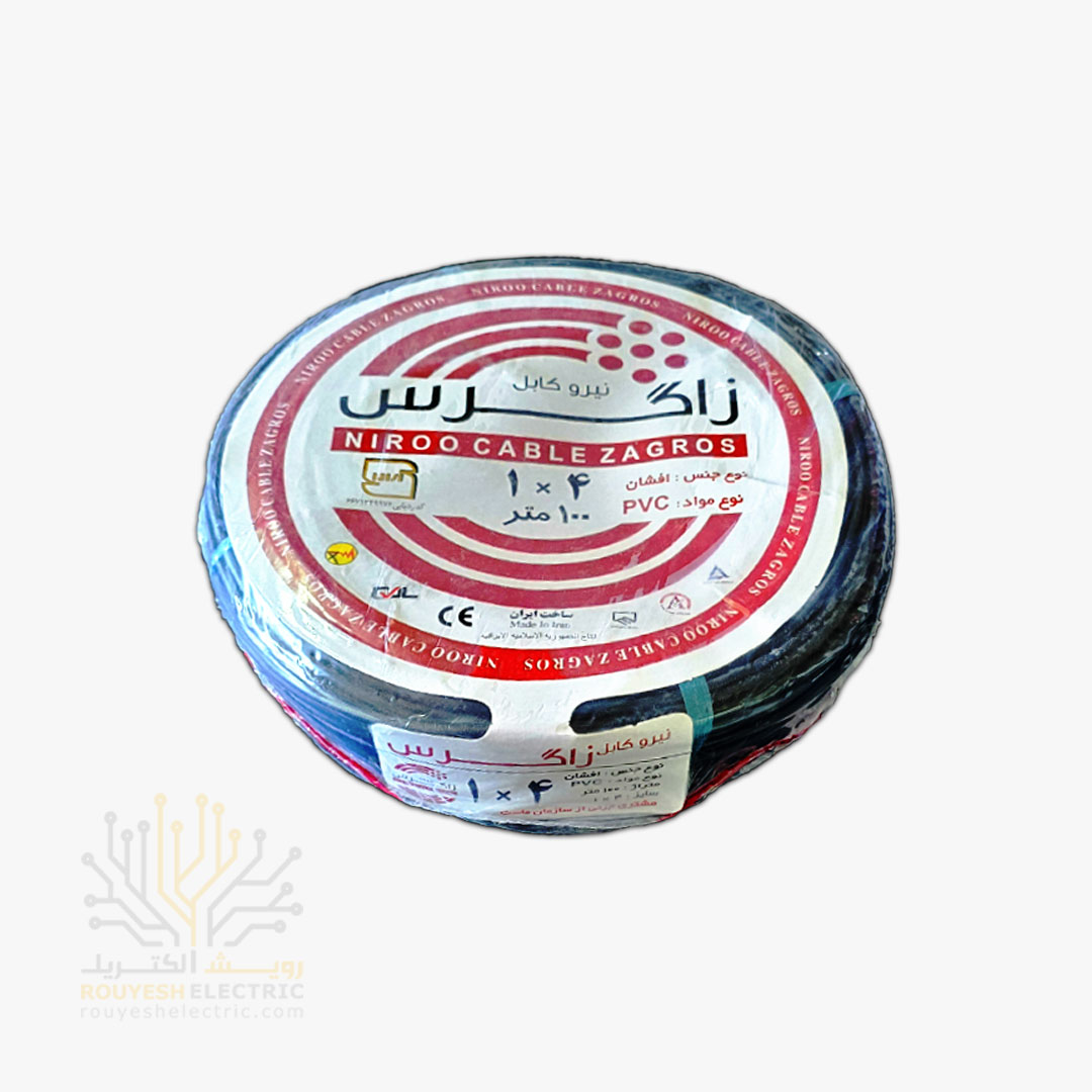 سیم برق نمره 1x4 برند نیرو کابل زاگرس استاندارد حلقه 100 متری رنگ مشکی موجود در شرکت ما تولید کشور ایران می‌باشد از جمله مزایای این محصول می‌توان به استاندارد بودن ، تنوع در رنگ ، نرم و انعطاف‌پذیر بودن مغزی مسی ، روشن بودن رنگ مس و روکش پلاستیکی با کیفیت اشاره کرد. این محصول دارای ضمانت سلامت محصول است که اطمینان خاطر مشتریان را نسبت به کیفیت جنس خریداری شده فراهم می‌سازد.