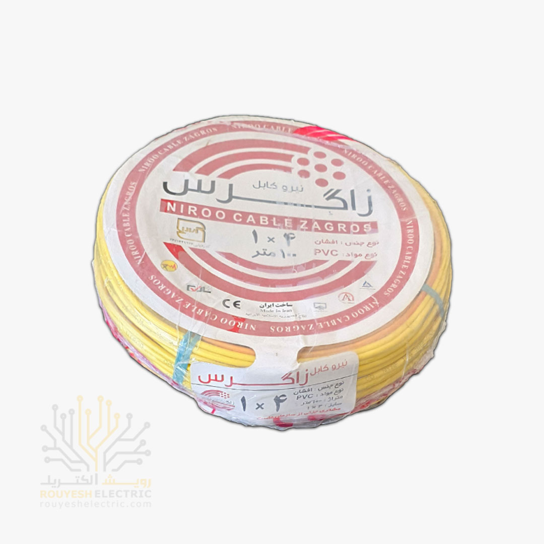 سیم برق نمره 1x4 برند نیرو کابل زاگرس استاندارد حلقه 100 متری رنگ زرد