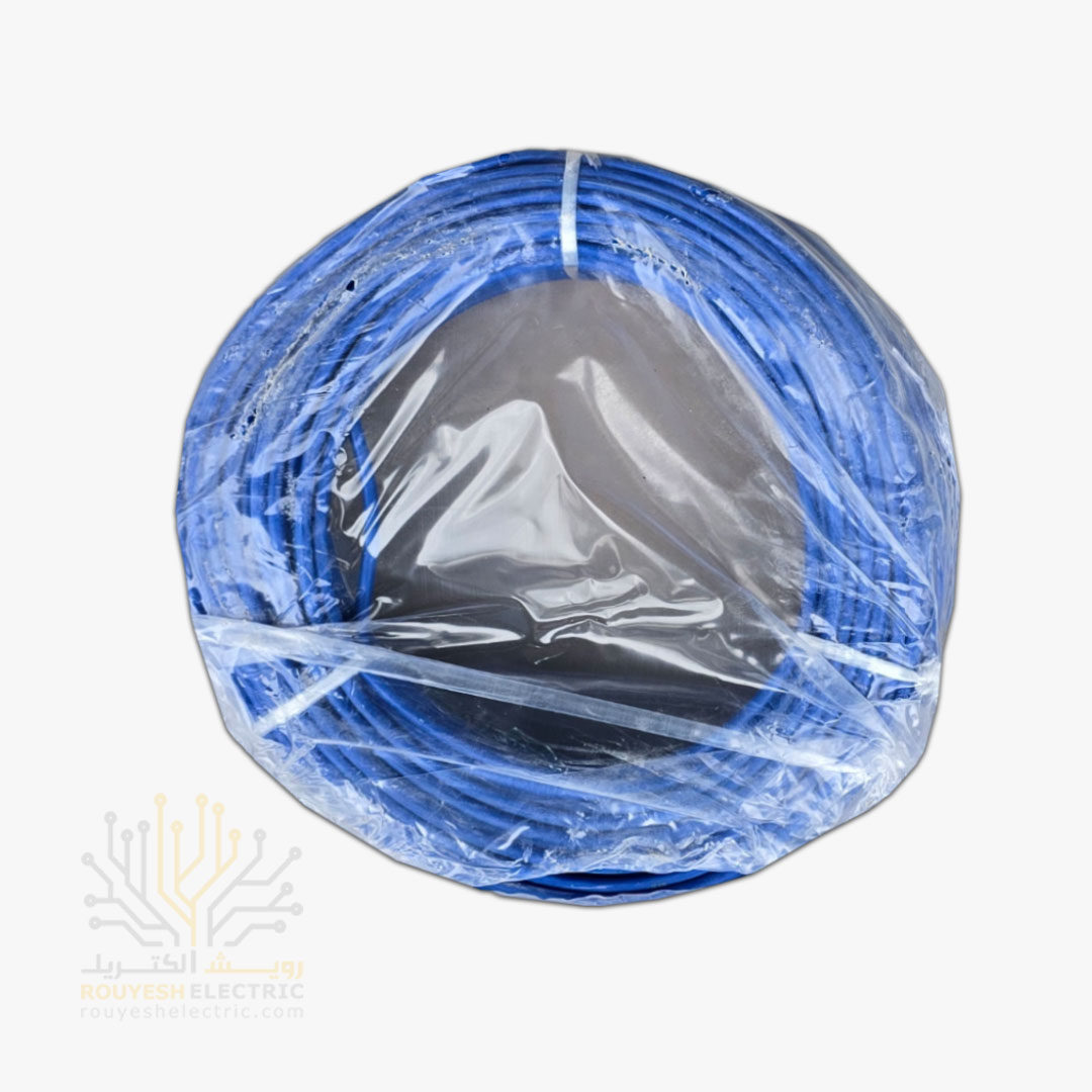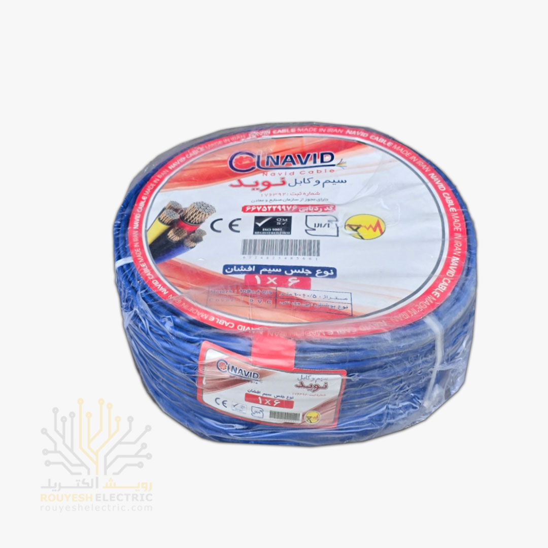 سیم برق نمره 1x6 برند نوید استاندارد رنگ آبی حلقه 100 متری