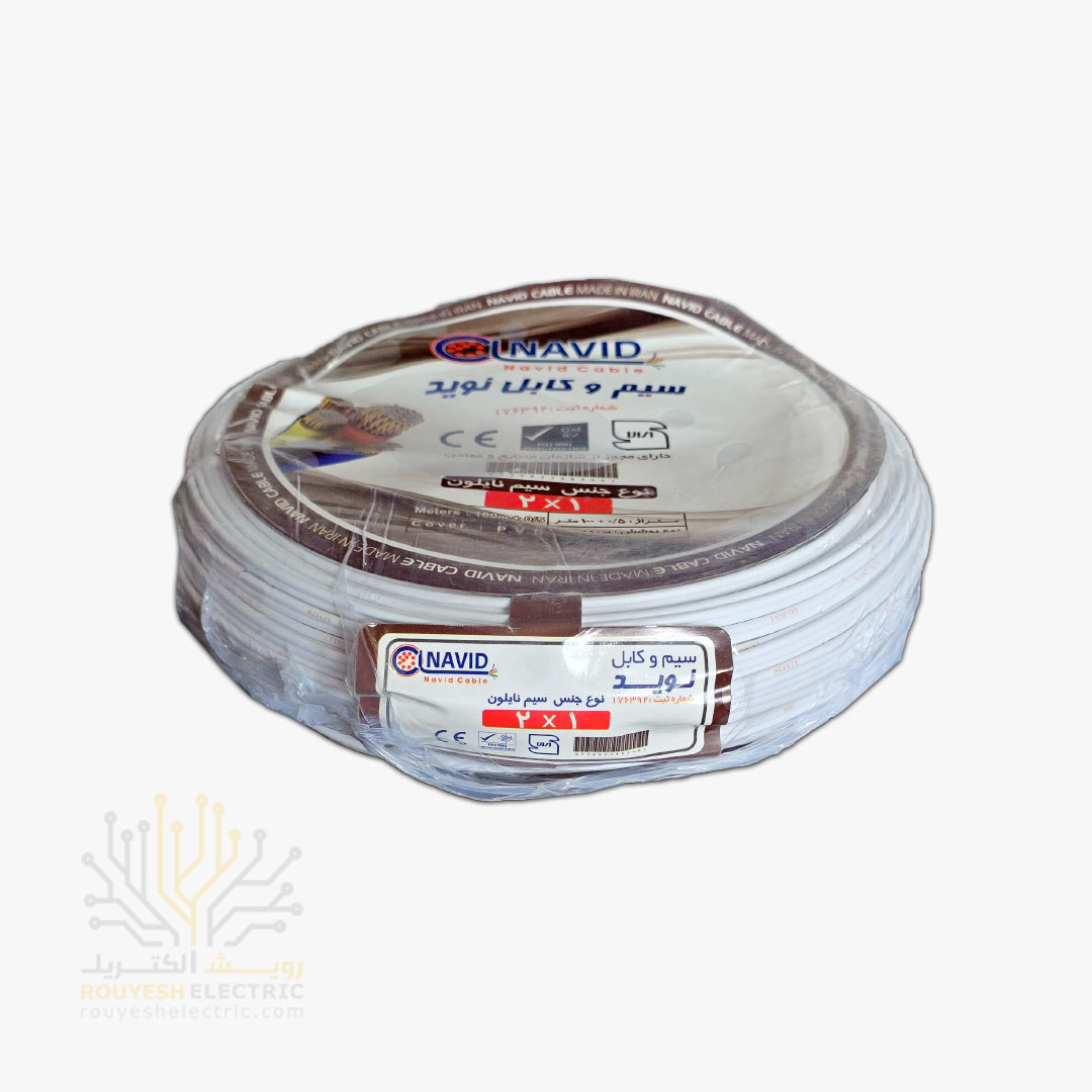 کابل برق نمره 2x1 برند نوید استاندارد حلقه 100 متری