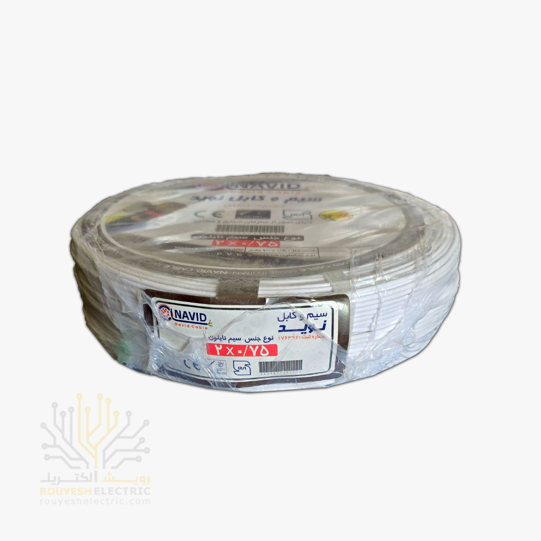 سیم برق نایلون نمره 2x0/75 برند نوید استاندارد حلقه 100 متری