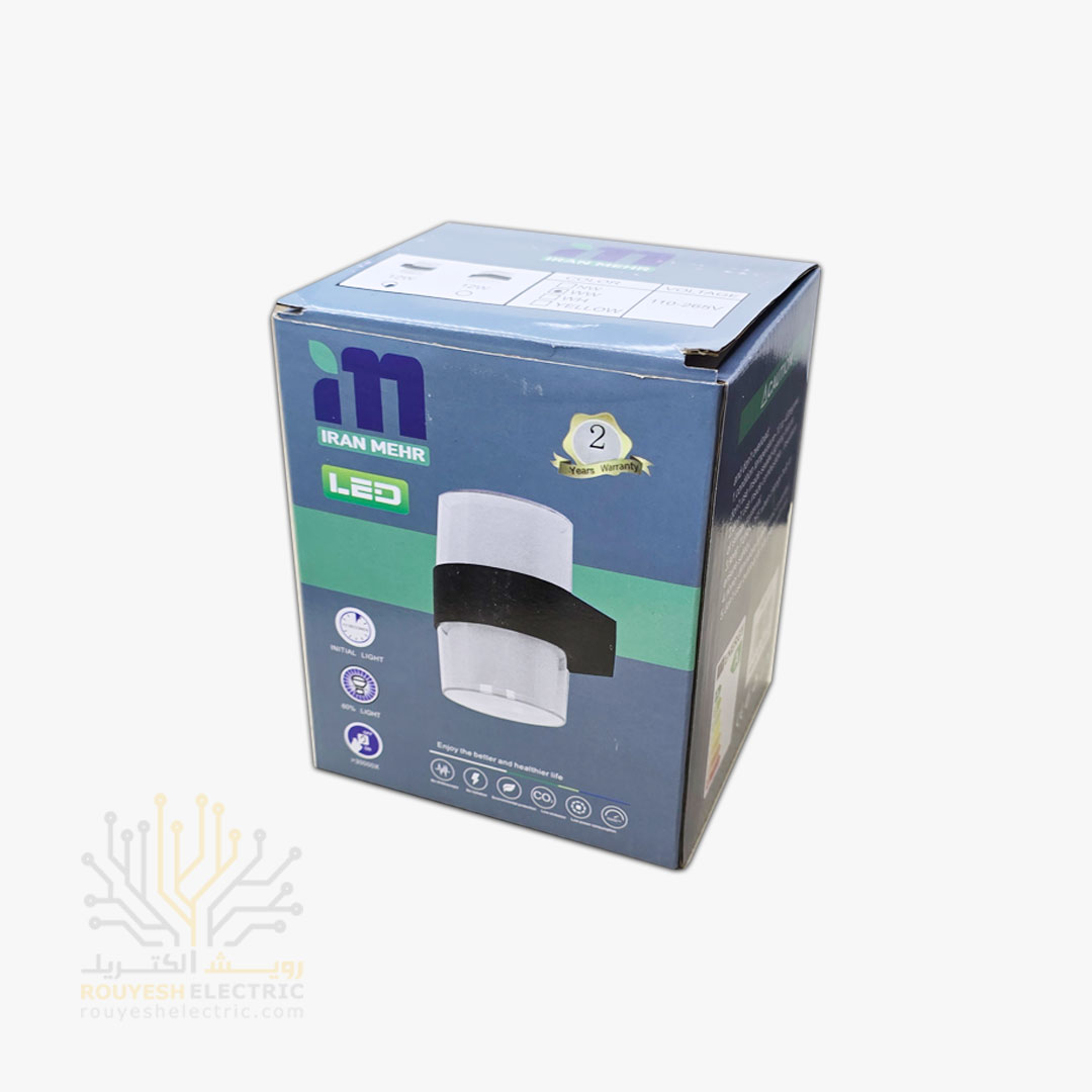 چراغ دیواری دکوراتیو ایران مهر مدل ایران ۱۹، با طراحی استوانه‌ای و نوردهی دوطرفه، گزینه‌ای مدرن و چشم‌نواز برای نورپردازی تزئینی در فضاهای داخلی و نیمه‌خارجی است. بدنه مشکی‌رنگ این محصول در کنار نور یخی (سفید سرد)، جلوه‌ای مینیمال و معماری به دیوارها می‌بخشد. این چراغ برای استفاده در راهروها، لابی‌ها، اتاق نشیمن، بالکن، راه‌پله‌ها و فضاهای تجاری یا مسکونی با طراحی مدرن بسیار مناسب است.